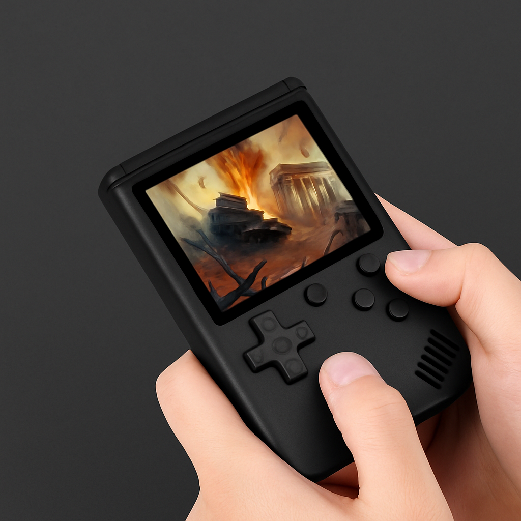Esta consola portátil estilo Game Boy es un tributo al juego clásico con un giro contemporáneo: un acabado en negro mate que desafía lo ordinario y rinde culto a la estética monocromática.
